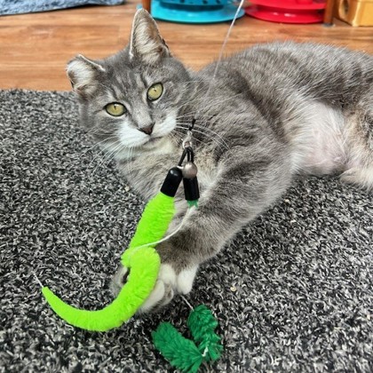 Hi, I'm Alice. I'm a sweet, curious girl who loves a quiet home and spending time with my people. I love napping under my blankies (who doesn't!), but when my foster is around, I pop out - a little like ET she says, whatever that means - and I'm right there next to her, ready for pets. I've discovered I really like playing with furry mice and wand toys. The one with the worm is my favorite! I also found out I don't like big dogs. I love my foster and enjoy being in a home. I'm hoping to get my own furrever home soon. From Alice's foster: Alice has really come alive and shown her sweet gentle disposition since she came to my home. At first she was hesitant to come out of her carrier, but as she realized this was a safe place, she got comfortable and settled right in. She is a lot of fun - she has the curiosity of a kitten at times, but also loves pets and just hanging out while I work. I think she would be a wonderful fun companion in a calm homeI am in a foster home so click the "Learn More About Me!" tab to fill out an application to meet me!