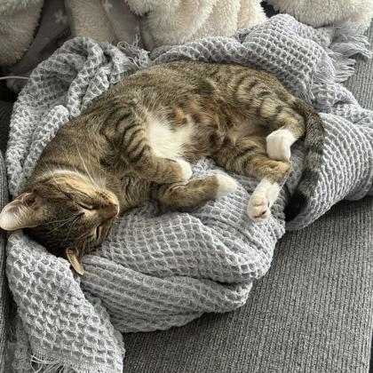 Meet Edna, a sweet girl who is the perfect combination of cuddles and athleticism. She loves nothing more than curling up with you for some cozy rest, but don't be fooled. She's also full of energy and will happily show off with her evening zoomies or with an intense string chasing sessions. She's just as happy basking in the afternoon sun as she is playing hard, making her an ideal companion for someone looking for a cuddle buddy and a fun-loving friend. She gets along wonderfully with kittens and adult cats, but especially the little ones. If you're looking for a loving, playful and well-rounded kitty friend, she may be the perfect match for you!