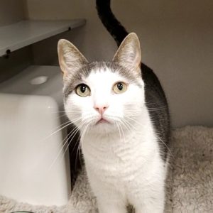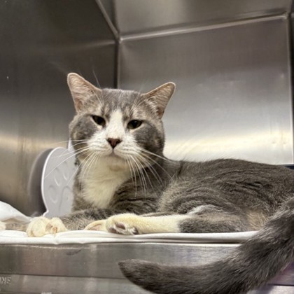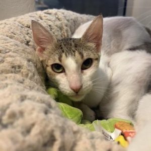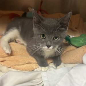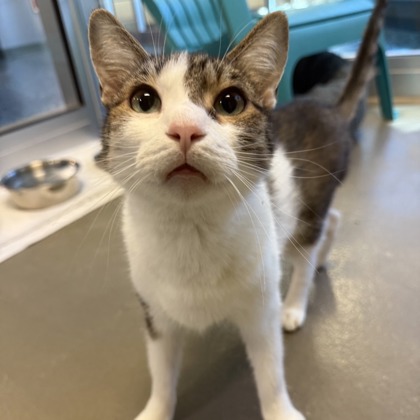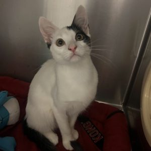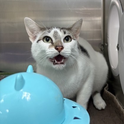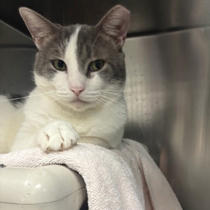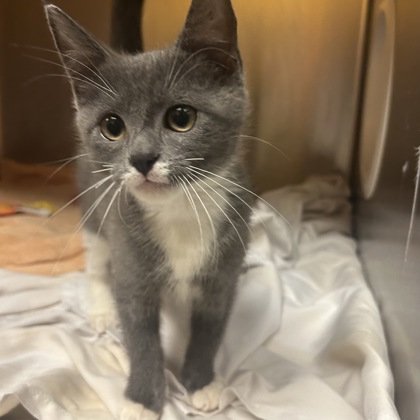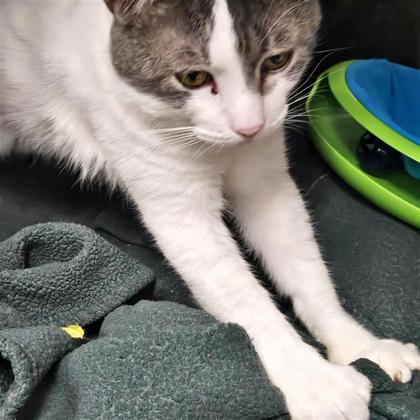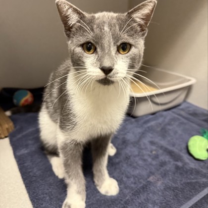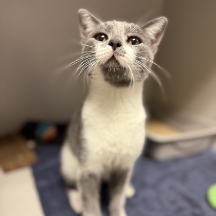 Hi! I'm Chunky Monkey, a cutie that is 4-months-old a white and grey, Male Domestic Short Hair. I'm friendly, affectionate, and love playtime just as much as cuddle time. I will be at the Greenville Ave. PetSmart beginning Friday 10/3/25.* Appointment is Required *