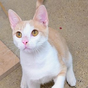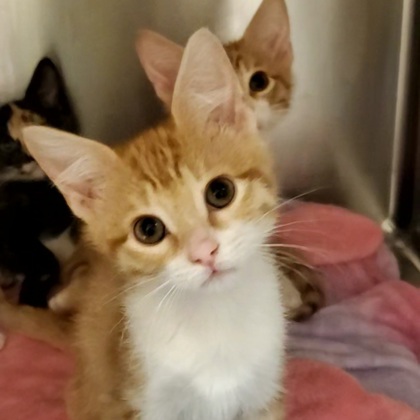 Hi! I'm Eve a cute, out going 2-1/2 month old Female, Orange and White, Domestic Short Hair Tabby. I am part of a litter that was found by a nice person along with our Mom. We all went to a Foster home for TLC and until we got bigger. Now I am ready to find a Family to join! I will be at the Denton PetSmart beginning Thursday 10/16/25.* Appointment is Required *