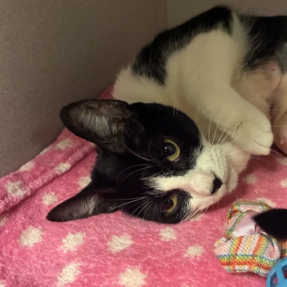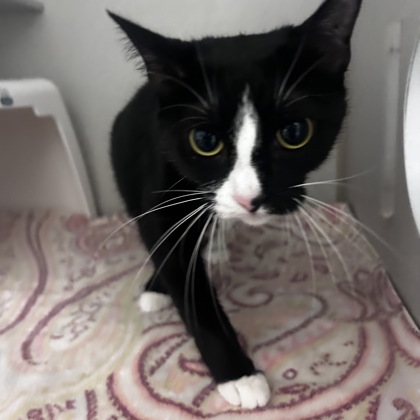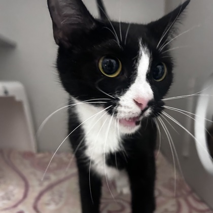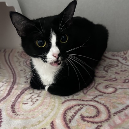 Meet Mosaic - Your Living, Purring Work of Art Say hello to Mosaic, a stunning 2-year-old tuxedo beauty whose tiny black spots look just like pieces of fine mosaic art-hence the name! She's not just a pretty face, though-this girl has personality. Whether she's lounging regally in her donut bed or keeping you up to date with all the kitty gossip, Mosaic is a sweetheart through and through. Mosaic is living with Calicivirus, a common and manageable upper respiratory condition. It's lifelong, but don't let that scare you-it just means she'll need to be the only cat in the home, or join a household with other cats who already have a history of Calicivirus. She's doing just fine and brings nothing but love, snuggles, and sass to the table. If you're looking for a little feline flair and a whole lot of love, Mosaic is your girl. She's ready to bring charm, cuddles, and a bit of cat drama (she's a talker!) into your life.If you are looking for the sweetest new addition to your family, I might be your girl! I'm currently in a foster home so please email Foster@spca.org to meet me!