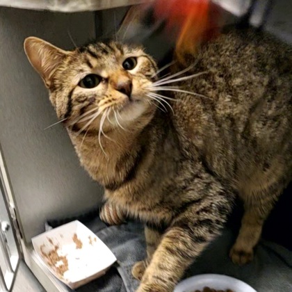 Hello, I'm Kyle a strong loving fellow. I am a 3-year old Male, Brown Domestic Short Hair Tabby that came to the SPCA of Texas with a wound on my side. I have been treated and am healing very nicely. Now all I need is a home to call my own. I am a playful cat with a an adventurous heart. I will be at the City Place PetSmart beginning Tuesday 3/31/26.* Appointment is Needed *