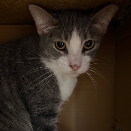 Hi, I'm Miss Muffet!I'm a sweet 3-year-old blue tabby with soft stripes and a gentle heart. I've left the wild kitten days behind and now love the perfect mix of playtime and cozy relaxation. Chasing toys, watching the world from a sunny window, and curling up in a comfy spot are some of my favorite things. I'm affectionate and love being near my people. You'll get soft purrs, gentle head bumps, and a loyal companion who enjoys quiet, peaceful moments as much as playful ones. I'd do best in a calm, loving home where I can feel safe and part of the family. If you're looking for a sweet, devoted friend with a big heart, I might be your perfect match. I'm ready to find my forever home and share all my love with you.Come meet me from 12 PM to 6 PM, open every day.No application or appointment required - walk-ins welcome.SPCA of Texas, 2400 Lone Star Drive, Dallas, TX 75212