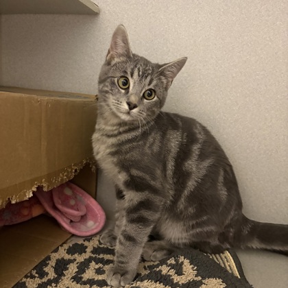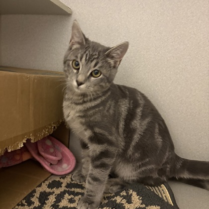 Hello, I'm Henry a sweet 3-1/2 month old Male Blue, Domestic Short hair Tabby. I am part of a litter that a nice person found, but could not keep. I sent Santa a letter saying that I wanted my very own Family for Christmas! I enjoy snuggling with my human and playing with my cat toys.I will be at the Greenville Ave. PetSmart beginning Thursday 12/18/25.* Appointment is Needed *