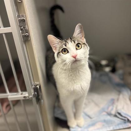 Hi! I'm Megan, a 6-month old Female, Black and White, Domestic Short Hair. I am a bright-eyed teenage kitten with a big personality and an even bigger heart! I enjoy the company of my human friends and seek it out. I also might be called (some might say nosy, but I prefer "investigative reporter"!). If there's a new sound, smell, or toy around, you can bet I'll be the first one to check it out!I will be at the Denton PetSmart beginning Tuesday 11/11/25.* Appointment is Needed *