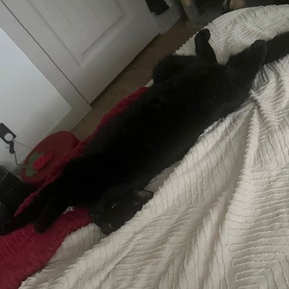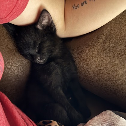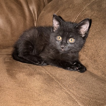 Hi! I'm Cinder I'm a 3-month-old black kitten with zoomies, big curiosity, and a soft spot for cuddles. I love chasing toys, exploring new places, and being your tiny shadow. If you're looking for a sweet little buddy to grow up with, I think we'd be purr-fect together!* Appointment is Needed *