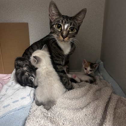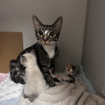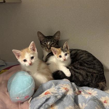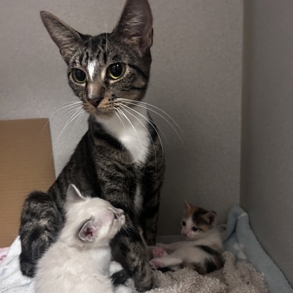 Hi, I'm Mira, and these are my three tiny babies: Rumi, Zoey, and Saja.We're getting ready to take our next big step-moving into a cozy foster home! I need a calm, loving space where my kittens and I can stay together for about 4-6 weeks while they grow, gain confidence, and get ready for their spay/neuter surgeries. Keeping us together (or in small groups/pairs) helps us feel safe and happy as we explore the world.I love caring for my babies and giving cuddles, and they love playing, snuggling, and purring alongside me. We're all ready to meet people who are patient, kind, and excited to help us thrive.All supplies will be provided for us, including food, bowls, crates, bedding, potty pads, and more. The SPCA of Texas Foster Team will guide you every step of the way to make sure we have everything we need.Please email foster@spca.org to learn more or schedule a pickup-we can't wait to meet our new friends!