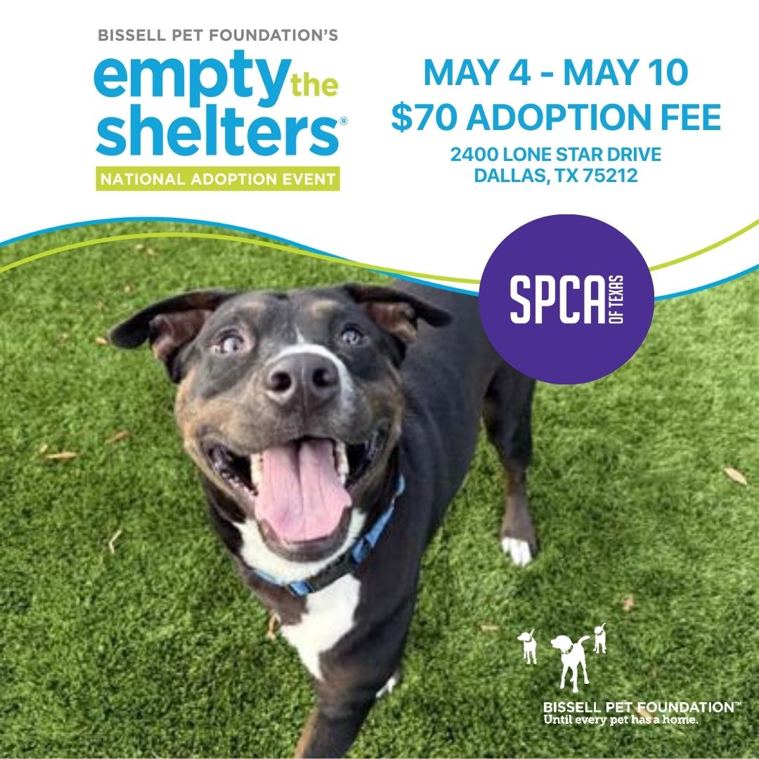 Bissell Empty The Shelters May 4 - May 10 Join the SPCA of Texas from May 4th-10th, during Bissell Empty the Shelters! Bissell Pet Foundation is sponsoring reduced adoption fees at hundreds of shelters nationwide, including the SPCA of Texas, celebrating with $70 adoptions at our Dallas Animal Care... Location / SPCA of Texas' Dallas Animal Care Center, 2400 Lone Star Dr., Dallas, TX Event Details
