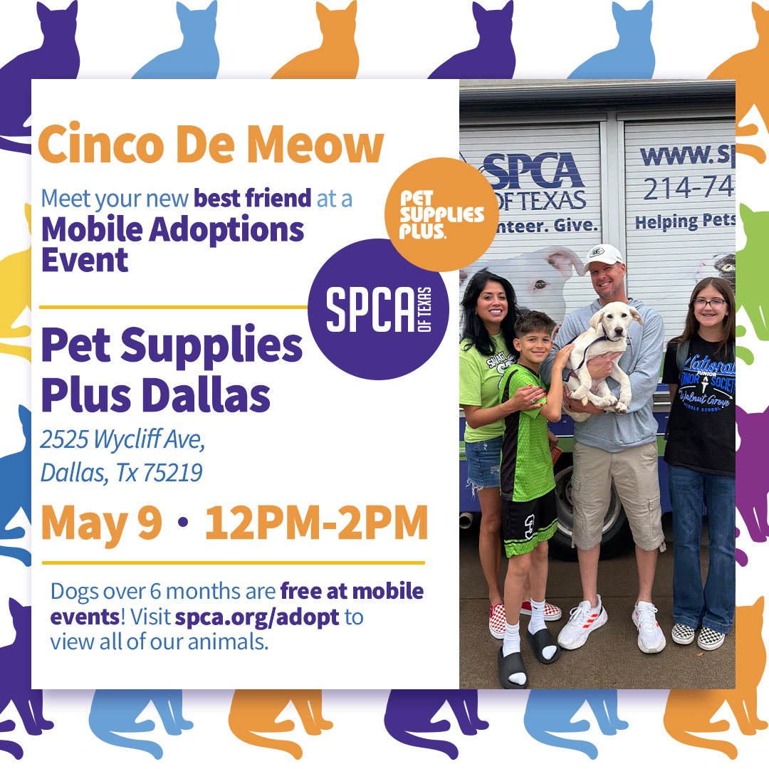 Cinco De Meow Mobile Adoptions at Pet Supplies Plus Dallas May 9 @ 12:00 pm - 2:00 pm Join the SPCA of Texas on Saturday, May 9th from 12pm-2pm for Cinco De Meow at Pet Supplies Plus Dallas, 2525 Wycliff Ave, Dallas, Tx 75219 and meet your new best friend! Location / Pet Supplies Plus Dallas, 2525 Wycliff AveDallas, Event Details