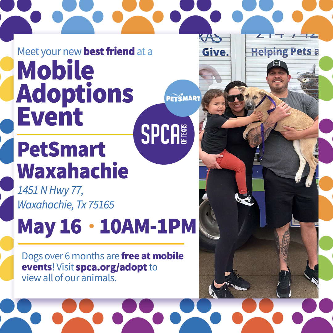Mobile Adoptions @ PetSmart Waxahachie May 16 @ 10:00 am - 1:00 pm Join the SPCA of Texas on Saturday, May 16th from 10am-1pm at PetSmart Waxahachie, 1451 N Hwy 77, Waxahachie, TX 75165 and meet your new best friend! Location / PetSmart Waxahachie, 1451 N Hwy 77, Waxahachie, TX Event Details