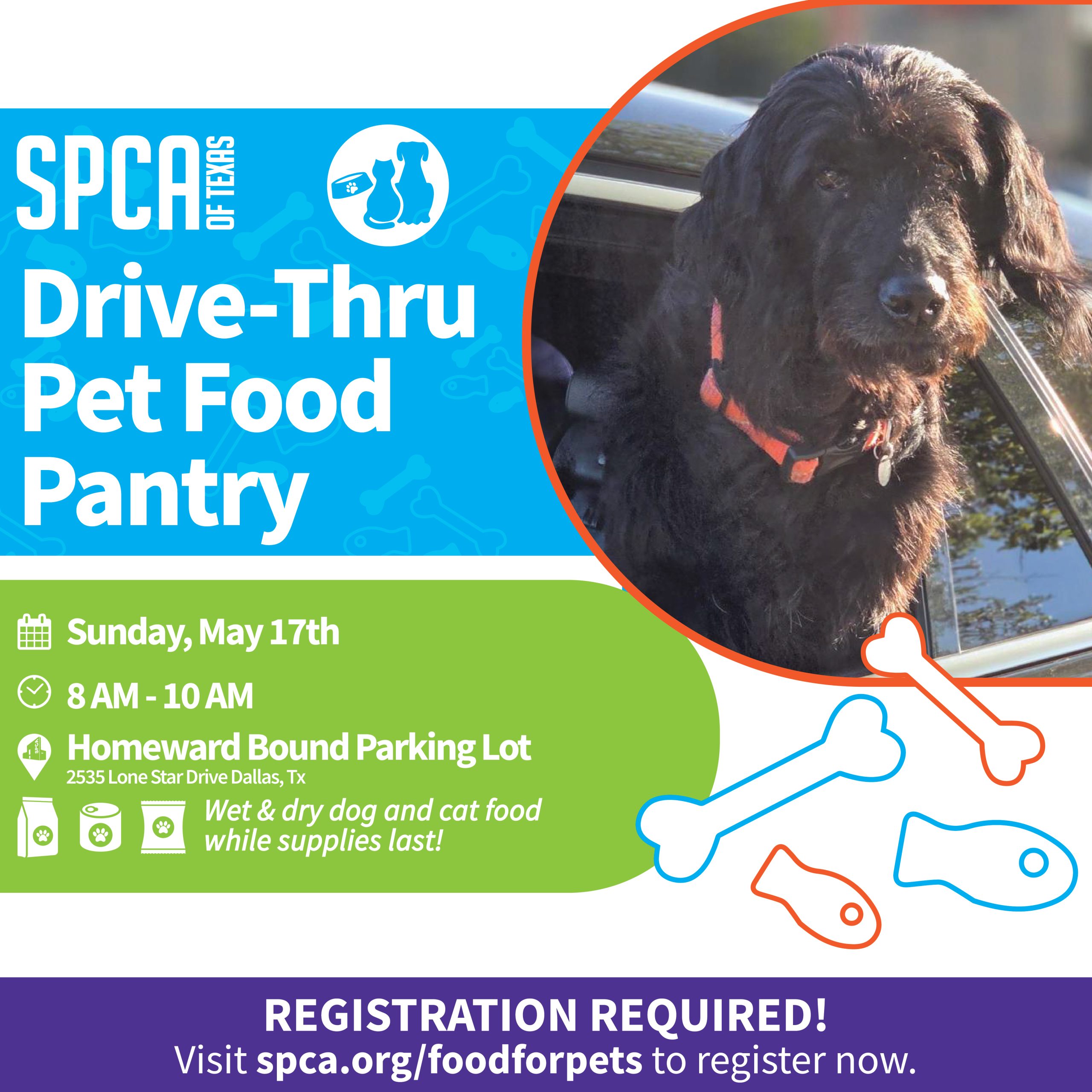 Drive-Thru Pet Food Pantry May 17 @ 8:00 am - 10:00 am Costs for your furry friend are going up, and we’re here to help! Join us Sunday, May 17 from 8 a.m. to 10 a.m. at the Homeward Bound parking lot at 2535 Lone Star Drive in Dallas for our drive-thru... Location / Homeward Bound Inc., 2535 Lone Star DriveDallas, Event Details