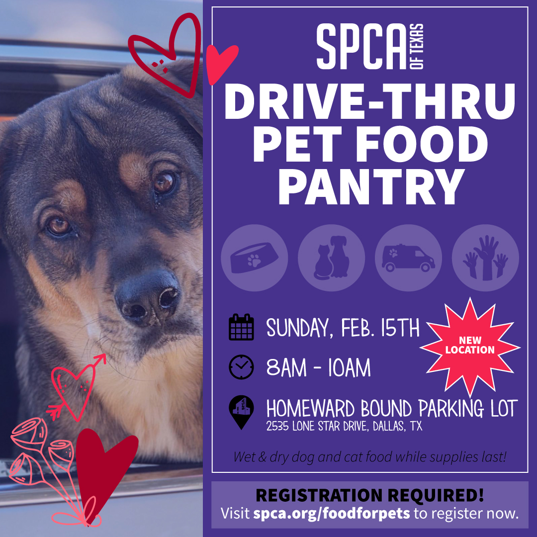 Drive-Thru Pet Food Pantry Feb 15 @ 8:00 am - 10:00 am Costs for your furry friend are going up, and we’re here to help! Join us Sunday, February 15 from 8 a.m. to 10 a.m. at the Homeward Bound parking lot at 2535 Lone Star Drive in Dallas for our drive-thru... Location / Homeward Bound Inc., 2535 Lone Star DriveDallas, Event Details