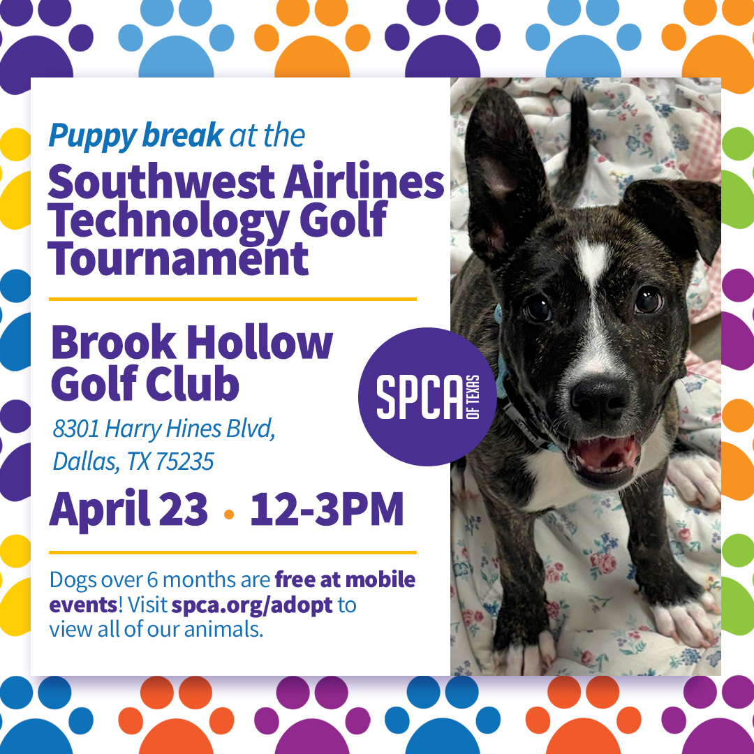 Puppy Break at the Southwest Airlines Technology Golf Tournament Apr 23 @ 12:00 pm - 3:00 pm Join the SPCA of Texas on Thursday, April 23rd at the Southwest Airlines Technology Golf Tournament from 12-3pm at Brook Hollow Golf Club, 8301 Harry Hines Blvd, Dallas, TX 75235 for a puppy break! Location / Brook Hollow Golf Club, 8301 Harry Hines BlvdDallas, Event Details
