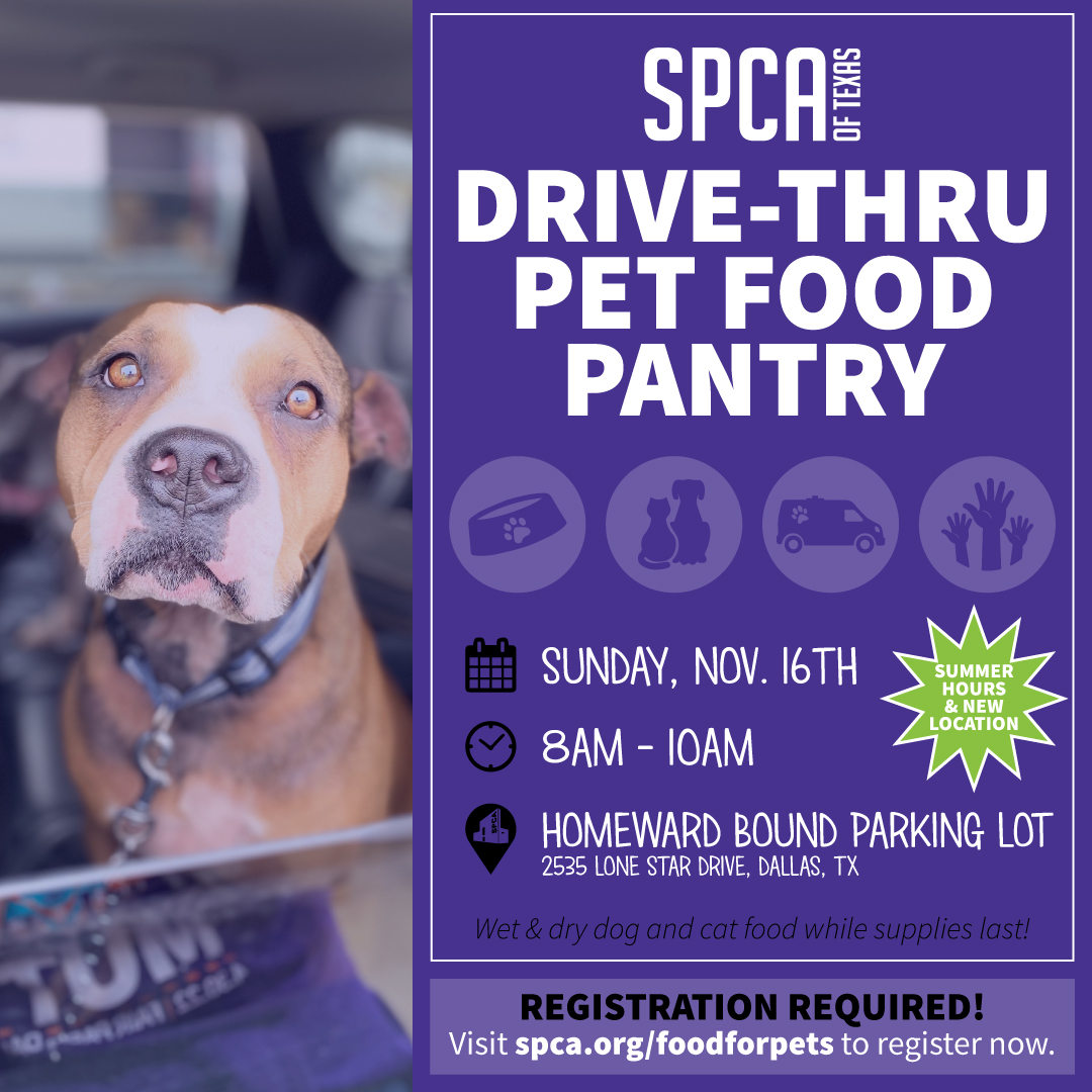 Drive-Thru Pet Food Pantry Nov 16 @ 8:00 am - 10:00 am Costs for your furry friend are going up, and we’re here to help! Join us Sunday, November 16 from 8 a.m. to 10 a.m. at the Homeward Bound parking lot at 2535 Lone Star Drive in Dallas for our drive-thru... Location / Homeward Bound Inc., 2535 Lone Star DriveDallas, Event Details