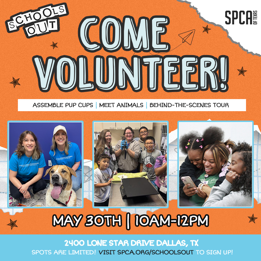 Schools Out… Come Volunteer! Family Volunteer Day at the SPCA of Texas May 30 @ 10:00 am - 12:00 pm Schools Out... Come Volunteer! Join us for Family Volunteer Day on Saturday, May 30th from 10 a.m. - 12 p.m. at our Dallas Animal Care Center at 2400 Lone Star Drive. Families with kiddos 10+ will have the chance to... Location / SPCA of Texas' Dallas Animal Care Center, 2400 Lone Star Dr., Dallas, TX Event Details
