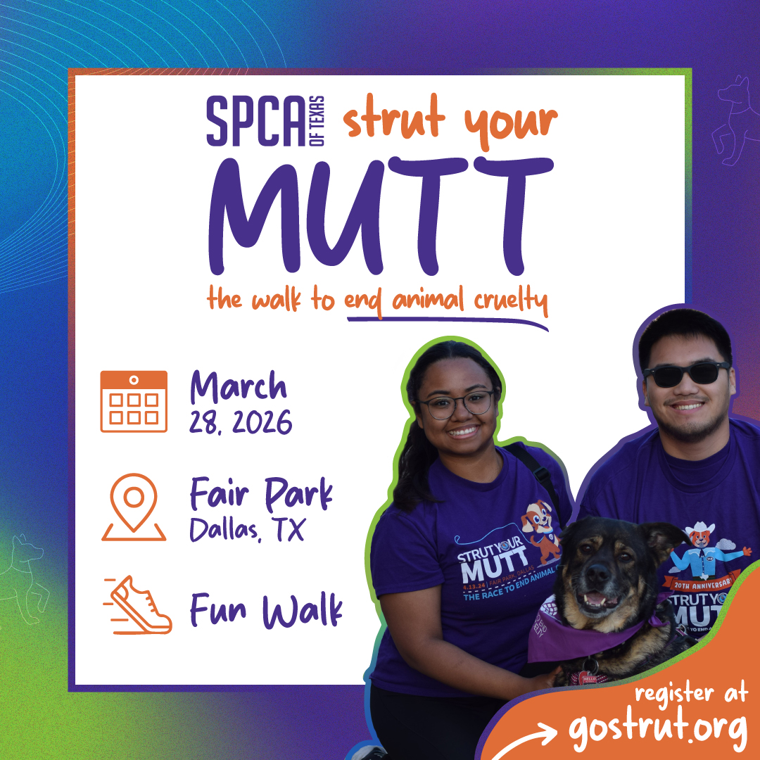 Strut Your Mutt 2026 Mar 28, 2026 ABOUT The Race to End Animal Cruelty. Strut your stuff with your furry best friend at Strut Your Mutt, The Race to End Animal Cruelty, celebrating 21 years! Strutters participate in the 3K fun run/walk as individuals or as part... Location / Fair Park, 3809 Grand Ave, Dallas, Texas Event Details