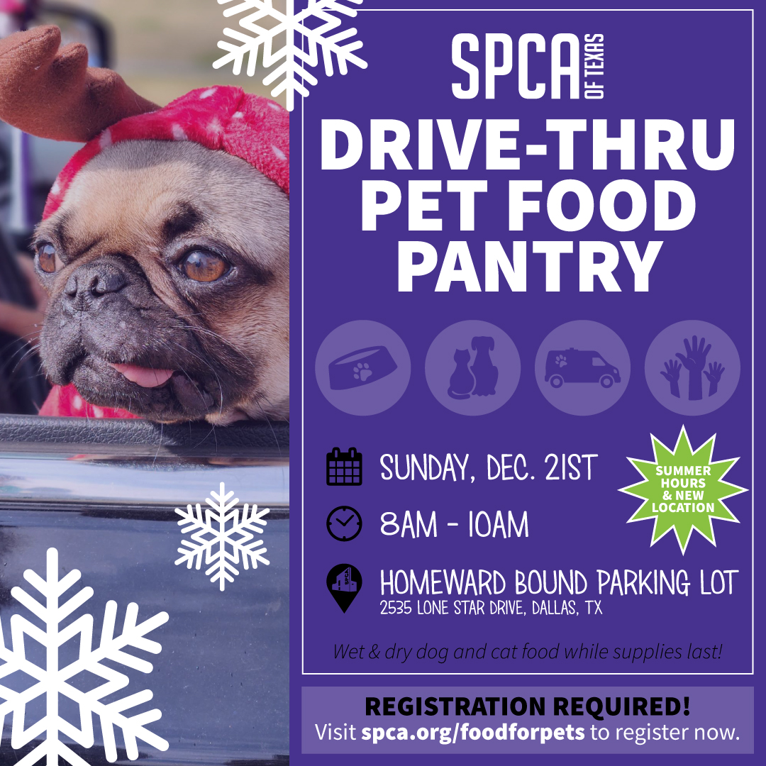 Drive-Thru Pet Food Pantry Dec 21 @ 8:00 am - 10:00 am Costs for your furry friend are going up, and we’re here to help! Join us Sunday, December 21 from 8 a.m. to 10 a.m. at the Homeward Bound parking lot at 2535 Lone Star Drive in Dallas for our drive-thru... Location / Homeward Bound Inc., 2535 Lone Star DriveDallas, Event Details