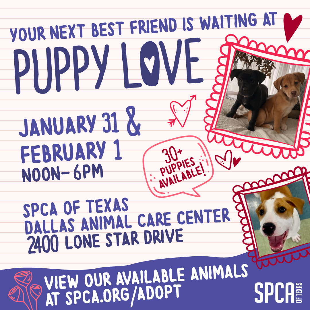 Puppy Love Adoption Event Jan 31 @ 12:00 pm - Feb 1 @ 6:00 pm Join the SPCA of Texas Saturday, January 31 and Sunday, February, 1 for Puppy Love! Come meet over 30 puppies and bring home your new best friend from noon-6PM at the SPCA of Texas' Dallas Animal Care Center, 2400 Lone... Location / SPCA of Texas' Dallas Animal Care Center, 2400 Lone Star Dr., Dallas, TX Event Details