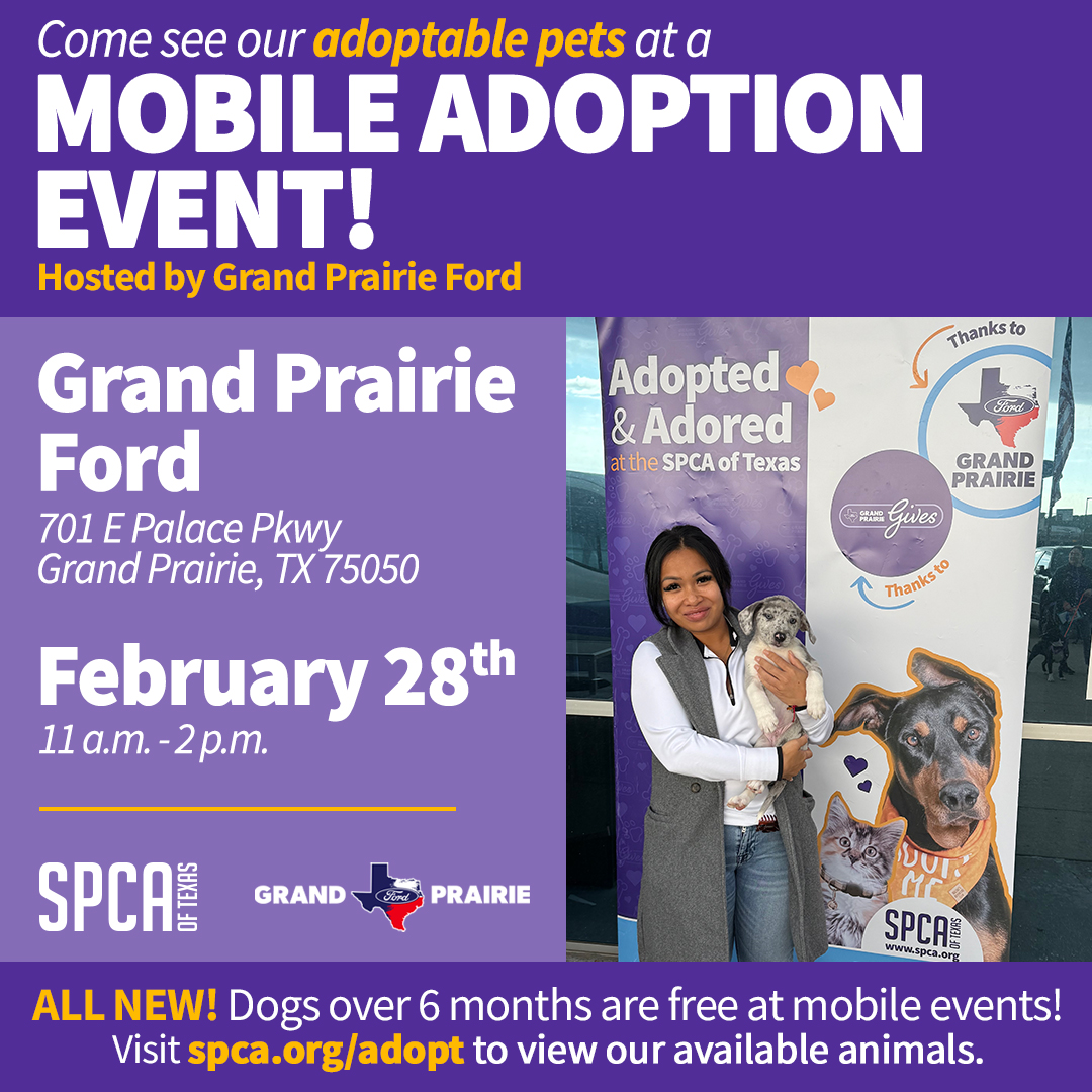 Mobile Adoptions @ Grand Prairie Ford Feb 28 @ 11:00 am - 2:00 pm Join the SPCA of Texas on Saturday, February 28th from 11am-2pm at Grand Prairie Ford, 701 E Palace Pkwy Grand Prairie, TX 75050 and meet your new best friend! Adoptions on-site at the event are sponsored by Grand Prairie Ford. Location / Grand Prairie Ford, 701 E Palace Pkwy, Grand Prairie, Texas Event Details