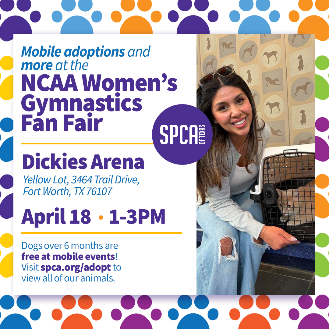Mobile Adoptions & More @ The NCAA Women’s Gymnastics Fan Fair Apr 18 @ 1:00 pm - 3:00 pm Join the SPCA of Texas on Saturday, April 18th from 1-3pm at Dickies Arena, Yellow Lot, 3464 Trail Drive, Fort Worth, TX 76107 and meet your new best friend! Purchase tickets now! Location / Dickies Arena, 3464 Trail DriveFort Worth, Event Details