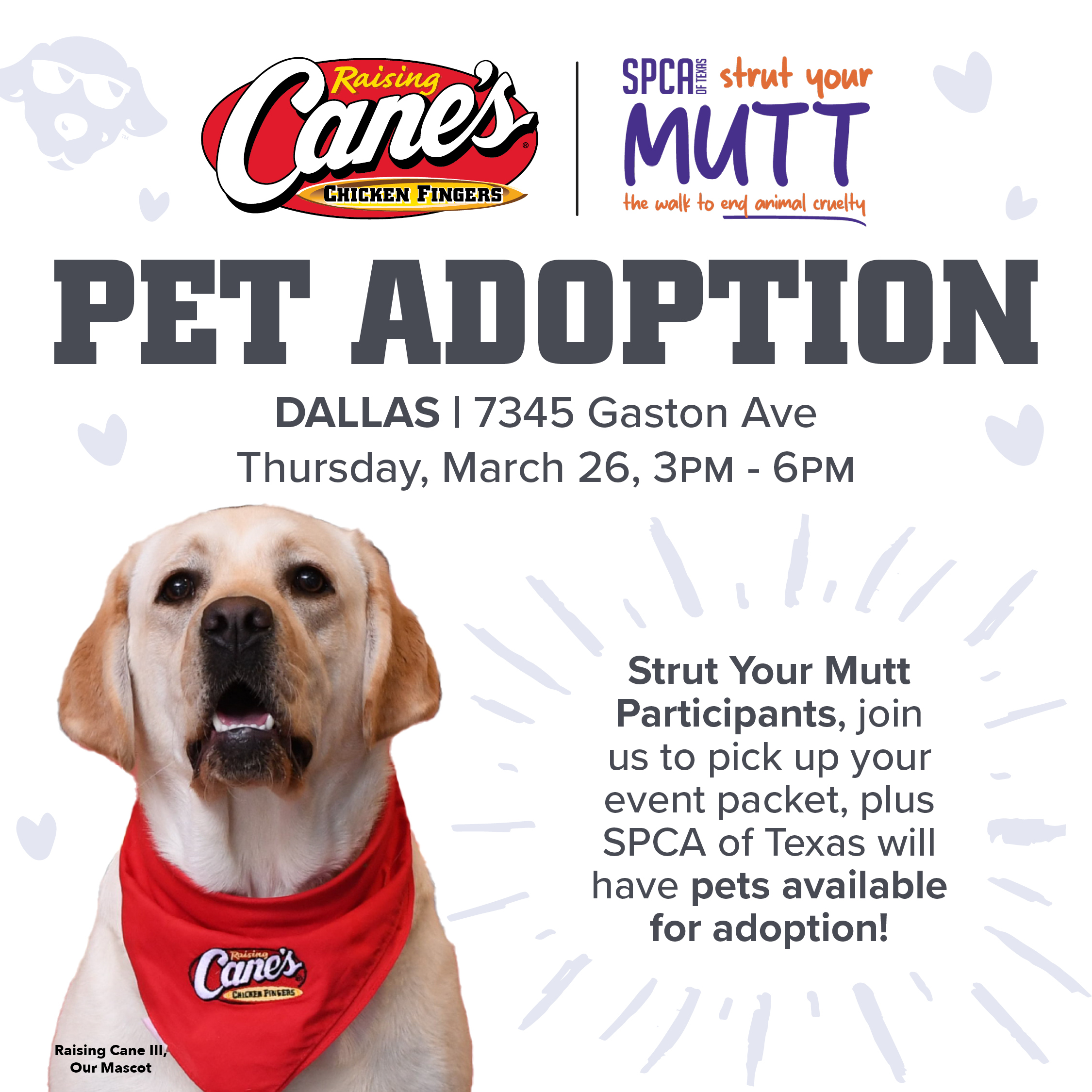 Mobile Adoptions at Raising Cane’s Dallas Mar 26 @ 3:00 pm - 6:00 pm Meet the SPCA of Texas Strut Your Mutt committee, pick up your packet, and meet your new bestie at Raising Cane's Dallas, 7345 Gaston Ave, Dallas, TX 75214 on Wednesday, March 26 from 3:00-6:00PM. PLUS register to join us at... Location / Raising Cane's, 7345 Gaston AveDallas, Event Details