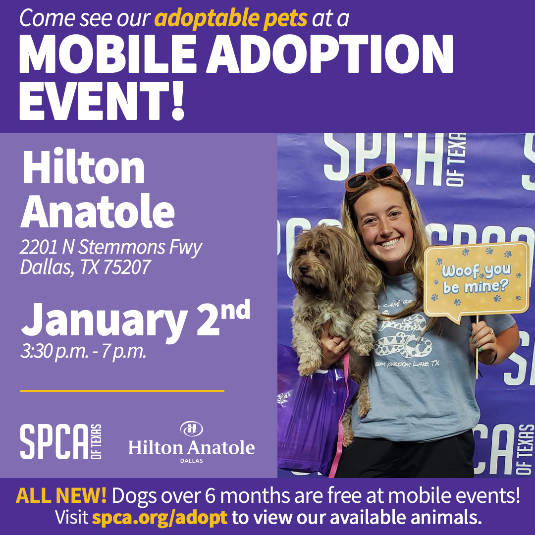 Mobile Adoptions at Hilton Anatole Jan 2, 2026 @ 3:30 pm - 7:00 pm Join the SPCA of Texas and meet your new best friend on January 2nd at Hilton Anatole, 2201 N Stemmons Fwy, Dallas, TX 75207 from 3:30 p.m. to 7 p.m. Location / Hilton Anatole, 2201 N Stemmons Fwy, Dallas, TX Event Details