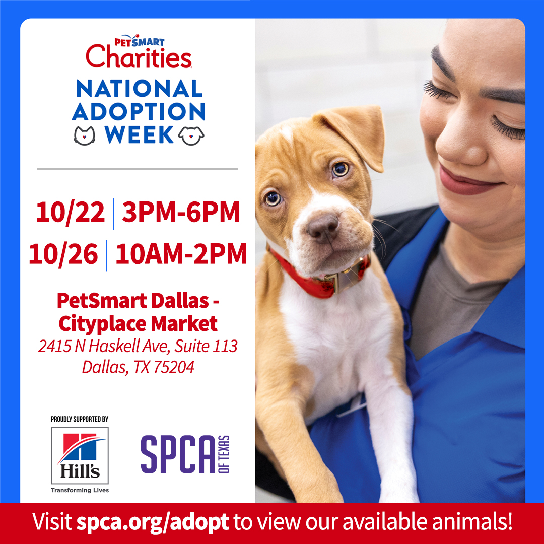 Mobile Adoptions @ PetSmart Cityplace Market – PetSmart National Adoption Week Oct 26 @ 10:00 am - 2:00 pm Join the SPCA of Texas during PetSmart Charities National Adoption Week October 20-26! Stop by one of our participating PetSmart locations to celebrate this special week and to bring joy to a homeless shelter pet. Cats and kittens are available for adoption... Location / PetSmart City Place, 2415 N Haskell Ave. STE 113Dallas, Event Details
