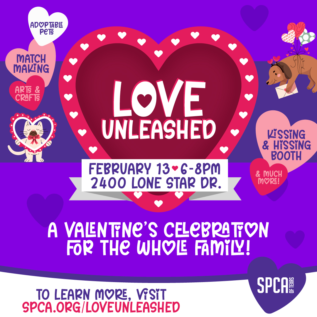 Fall head over paws this Valentine’s Day at Love Unleashed on Friday, February 13th from 6-8 PM at the SPCA of Texas’ Dallas Animal Care Center, 2400 Lone Star Drive, Dallas, TX 75212. —an evening packed with furry friends, sweet surprises, and heart-melting fun for all ages.