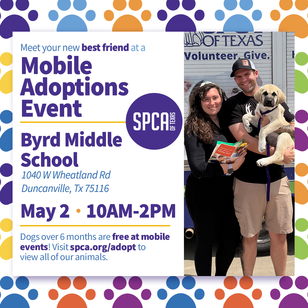 Join the SPCA of Texas on Saturday, May 2nd from 10am-2pm at Byrd Middle School, 1040 W Wheatland Rd, Duncanville, Tx 75116 and meet your new best friend!