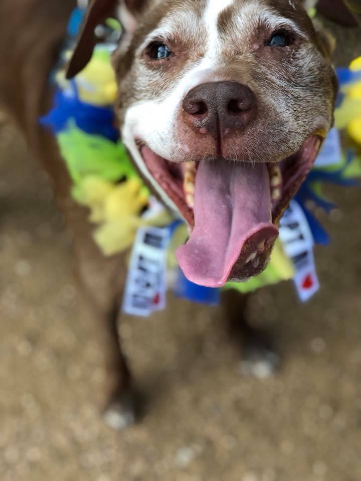 In 2018, the SPCA of Texas’ Animal Cruelty Investigations unit rescued a brown senior pitbull with a sad face and a sweet heart. Over time, his scars healed and his smile bloomed, charming every person he met. It was hard not to fall for a dog with so much love to give.