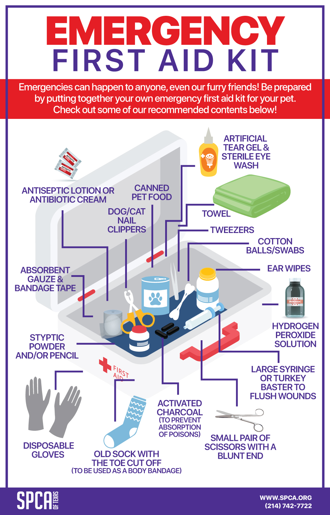 Every home and vehicle needs to have a basic first aid kit. You can find one for purchase or put together a kit yourself. Pet first aid kits are fairly similar to human first aid kits, but there are a few key items you want to make sure you have in your kit for your pet, noted in the infographic below.