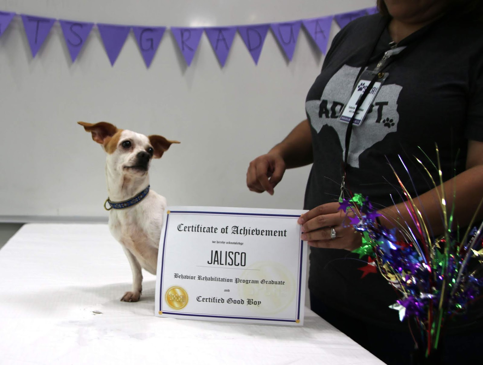 Jalisco came to the SPCA of Texas through an animal cruelty case. Frightened, stressed and suspicious of humans, Jalisco was an ideal candidate to be the first dog to take part in our brand new Behavior Rehabilitation Program. With the careful, consistent implementation of training protocols specifically designed to reduce fear and stress, our behavior specialists were able to make slow and steady progress in getting Jalisco to accept humans.